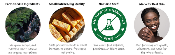 Our bath and body care is grown, infused, and crafted on a small organic farm where natural ingredients meet time-honored methods. What started as a solution to our own skin struggles has become a mission to share honest, nourishing products with you