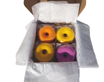 Four individually-wrapped donut bath bombs are beautifully packed in a green gift box. These bath bombs are not only fun, but they are also functional! Each bath bomb is made with ingredients like Epsom salt, and olive oil to relax the muscles and soothe and nourish the skin. As those ingredients work on your skin, the scent will transport you to an ooey-gooey donut shop filled with the fragrance of sweet donuts.